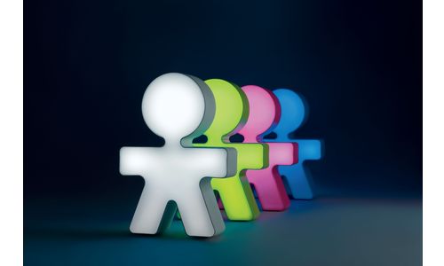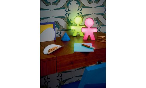 La figure emblématique du bonhomme Girotondo, dessiné par Stefano Giovannoni et Guido Venturini à la fin des années '80, continue son voyage dans le temps, en se transformant à chaque fois en un objet spécial. Des accessoires pour la table à ceux pour la cuisine, des objets pour le bureau jusqu'aux petits éléments de décoration, comme cette lampe de table à LED conçue par les King-Kong pour s'adapter à différents usages et de mutiples contextes. Munie d'une batterie rechargeable, Ronde peut être utilisée aussi bien comme lampe de table - branchée sur le réseau domestique - que comme lampe portable, à poser où vous souhaitez bénéficier de sa douce lumière diffuse. Interrupteur On/Off avec fonction de variation de la lumière qui permet trois différents niveaux d'intensité lumineuse.