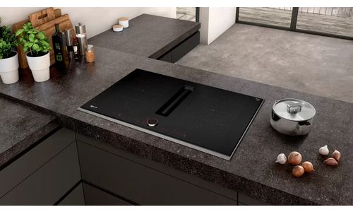 Cette table de cuisson avec aspiration intégrée réunit deux appareils en un et offre une vue dégagée pendant la cuisson.