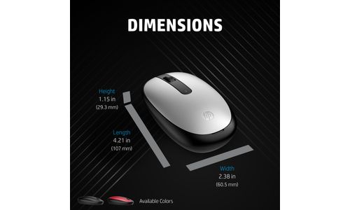 HP Souris Bluetooth 240. Format: Ambidextre. Technologie de détecteur de mouvement: Optique, Interface de l'appareil: Bluetooth, Résolution en mouvement: 1600 DPI, Type de boutons: Boutons poussoirs, Quantité de boutons programmables: 3, Type Scroll: Roue. Source d'alimentation: Piles. Couleur du produit: Noir