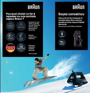• Cette action est exclusivement destinée aux particuliers et valable à l’achat d’un fer à repasser ou d’une centrale vapeur deBraun*, du 1er janvier 2026 au 30 juin 2026.