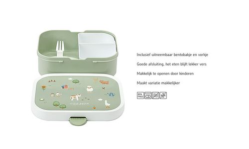 Optez pour la variété avec la boîte à lunch Little Farm de Mepal, comprenant un récipient bento amovible. Cela rend les possibilités d'un excellent déjeuner pour enfants presque infinies. Du pain frais et des fruits colorés ? Ou une collation salée pour l'école ? Morceaux de fromage, saucisses, noix ou fruits secs ? Choisissez et mélangez à votre guise et gardez-le agréablement facile et bien séparé ! Grâce au récipient bento, la boîte à lunch est divisée en différents compartiments. Avec deux compartiments séparés, le bento garde tout ce qui se trouve dans la boîte à lunch toujours merveilleusement frais. Préféreriez-vous avoir « seulement » quatre sandwichs ? Retirez le récipient à bento et vous avez suffisamment de place ! Bien entendu, la boîte à lunch et le récipient à bento peuvent simplement être mis au lave-vaisselle après utilisation.