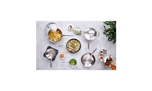 Les courbes arrondies, la forme semi-bombée et le couvercle en verre de Belvia donnent à cette batterie en inox de qualité une apparence douce et ludique.