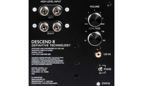 De DN8 is uitgerust met een 500-watt piek custom klasse D digitale versterker, ontworpen om het maximale uit de 3XR Architectuur van de DN8 te halen. Deze aangepaste versterking levert de Descend DN8 genoeg vermogen en efficiëntie om zo laag als 35Hz uit een één voet brede box te spelen.