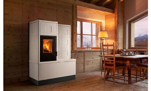 Een grote kachel met een hybride vuurhaard: hout- en pelletverbranding. Het majolica van de grote panelen is fijn bewerkt met bas-reliëfversieringen die de afwerking verrijken. Het bovenoppervlak van de bank is gemonteerd op een rolblad voor gemakkelijke toegang tot de pellettank.