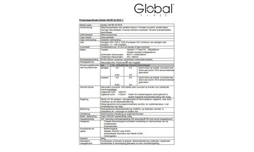 De Global 100 BF is een inbouwhaard op gas met een breed panoramisch vuurzicht. Kenmerkend zijn de ondiepe inbouw en de onbeperkte plaatsingsmogelijkheden. Bediening van de haard kan met de standaard meegeleverde afstandsbediening met elektronische ontsteking, thermostaat en klok functies. Het lage gasverbruik resulteert in een zeer hoog rendement, en dat alles tegen een heel aantrekkelijke prijs.